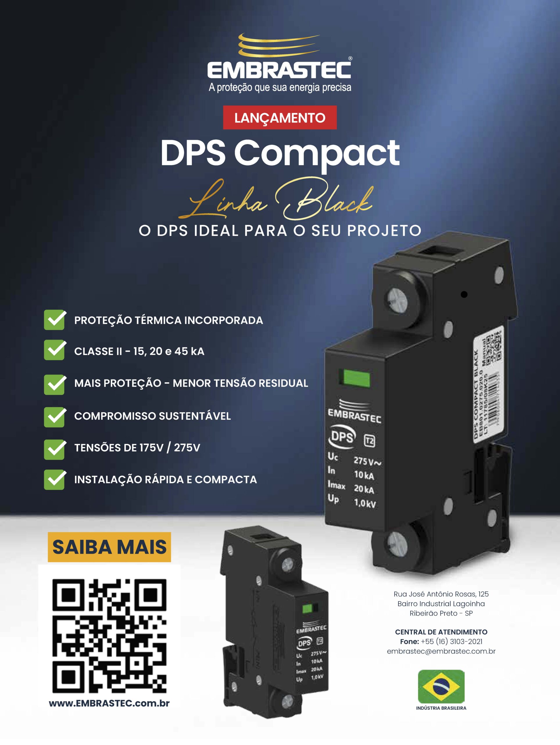 O DPS Compact Classe II é indicado para proteção de circuitos com tensão de fase de 220 Vca. Apropriado para quadros de energia secundários, protegendo os equipamentos eletroeletrônicos conectados ao circuito elétrico.