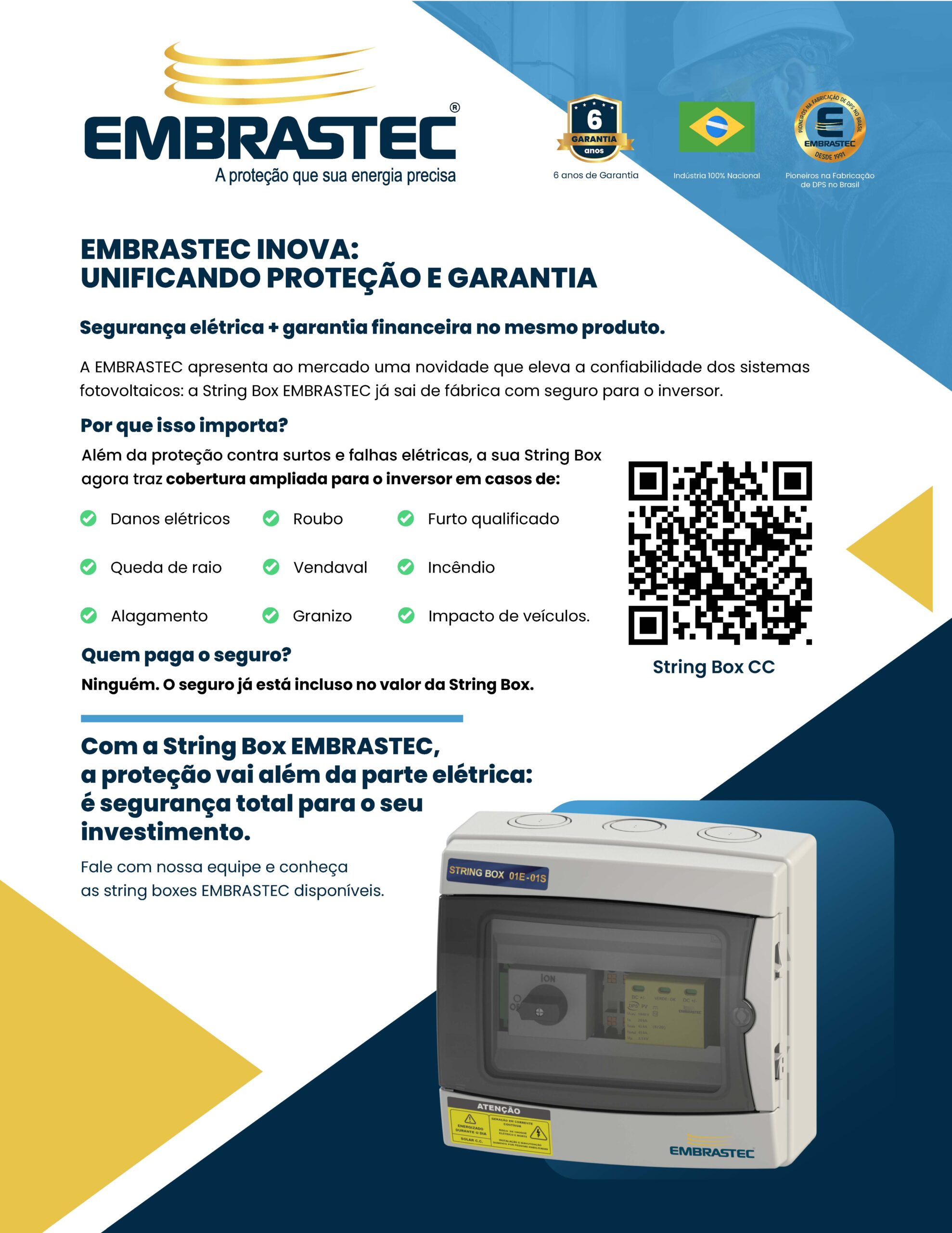 Eficiência Comprovada: Quando se trata de eficiência elétrica, a Linha de String Box EMBRASTEC é a mais qualificada. Garanta operações otimizadas e proteção sólida com uma solução projetada para durar.